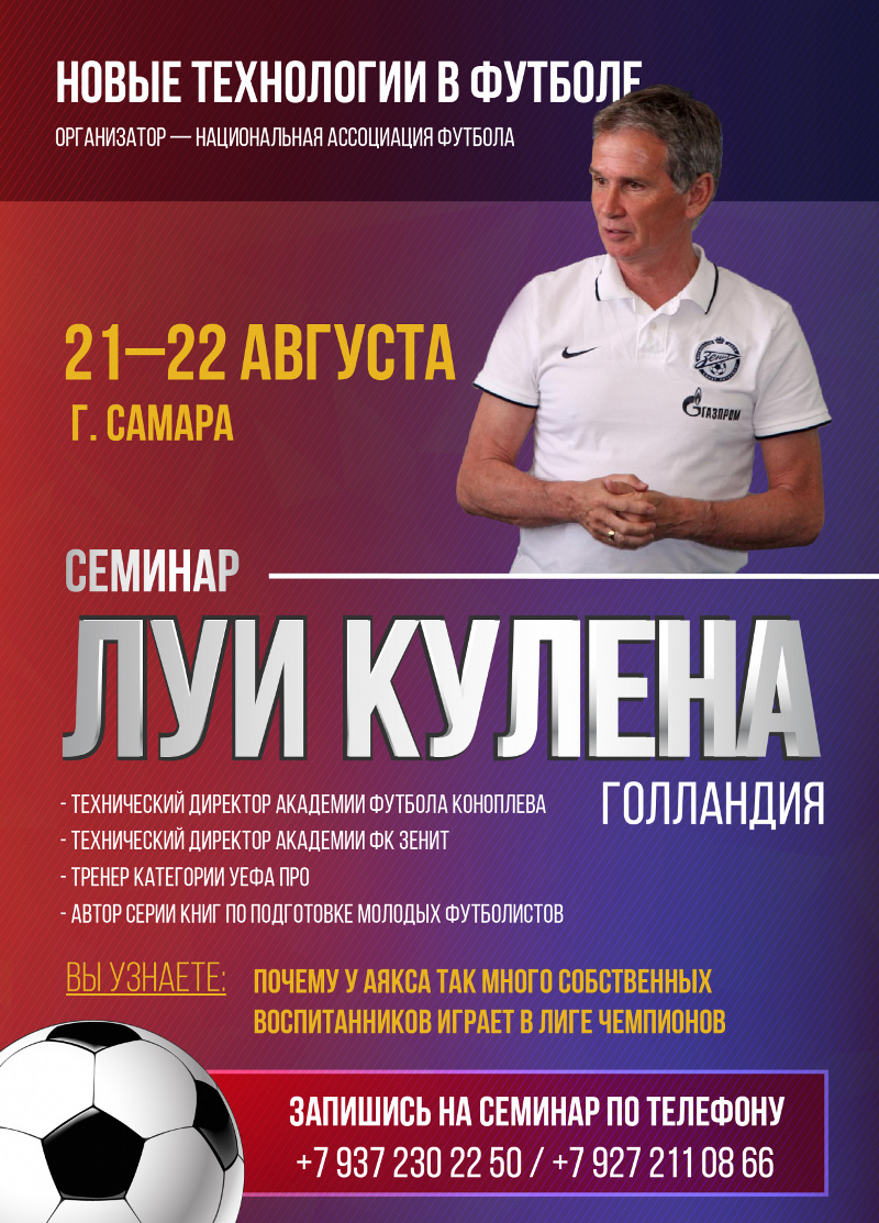 21-22 августа в г.Самара будет проходить семинар голландского специалиста категории UEFA PRO Луи Кулена (Голландия). Автор книг по технике и тактике футбола, воспитанник ФК «ПСВ» (Эйндховен), работал в Академии футбола им.Ю.Коноплева (г.Тольятти), Академии ФК «Зенит» (г.Санкт-Петербург) и других европейских клубах.