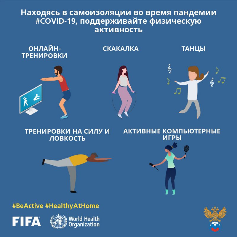 Общероссийская общественная организация «Российский футбольный союз» сообщает о том, что ФИФА, Организация Объединенных Наций (ООН) и Всемирная организация здравоохранения (ВОЗ) запустили кампанию #BeActive ("Быть активным"), призванную побудить людей быть #HealthyAtHome ("Здоровыми дома"), когда мир совместно и ежедневно борется с COVID-19.